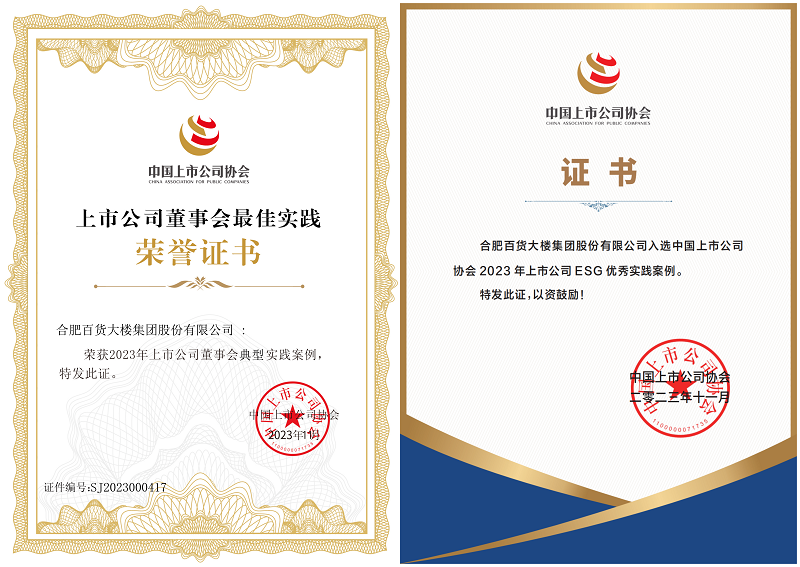 ESG聚焦环境、社会、公司治理绩效,成为衡量公司发展可持续性和未来发展潜力的重要价值体系。近期,中国上市公司协会主办的“2023年上市公司董事会最佳实践案例”、“2023年上市公司ESG优秀实践案例”评选榜单相继隆重揭晓,合肥百货董事会以优异表现首度荣膺“董事会典型实践案例”;公司凭借ESG工作的优秀实践经验再次被评选为“上市公司ESG优秀实践案例”,受到资本市场的高度认可。
