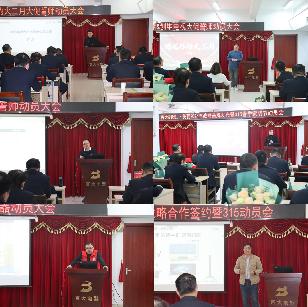 2024年2月22日,百大电器“315春季家装节”大促动员会在公司总部6楼会议室召开。党委书记,董事长马开峰、党委副书记,总经理张洪、合肥门店店长及采购负责人参加现场会议,异地门店店长参加视频会议。