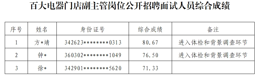 百大电器门店副主管岗位公开招聘面试工作已结束,现将综合成绩等有关事项公告如下: